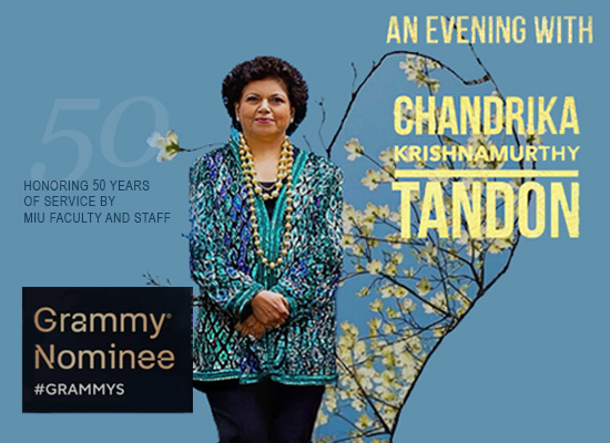MIU President Dr. Tony Nader and the Board of Trustees warmly invite you to an historic concert honoring 80 MIU Faculty and Staff who have served MIU for 30-50 years. Join us for an evening of music from Grammy-nominated muscial artist Chandrika Krishnamurthy Tandon.
